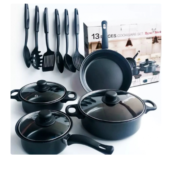 El set incluye 3 ollas (grande, mediana y pequeña), 1 sartén, 3 tapas de vidrio templado y 6 utensilios de cocina (espátulas).